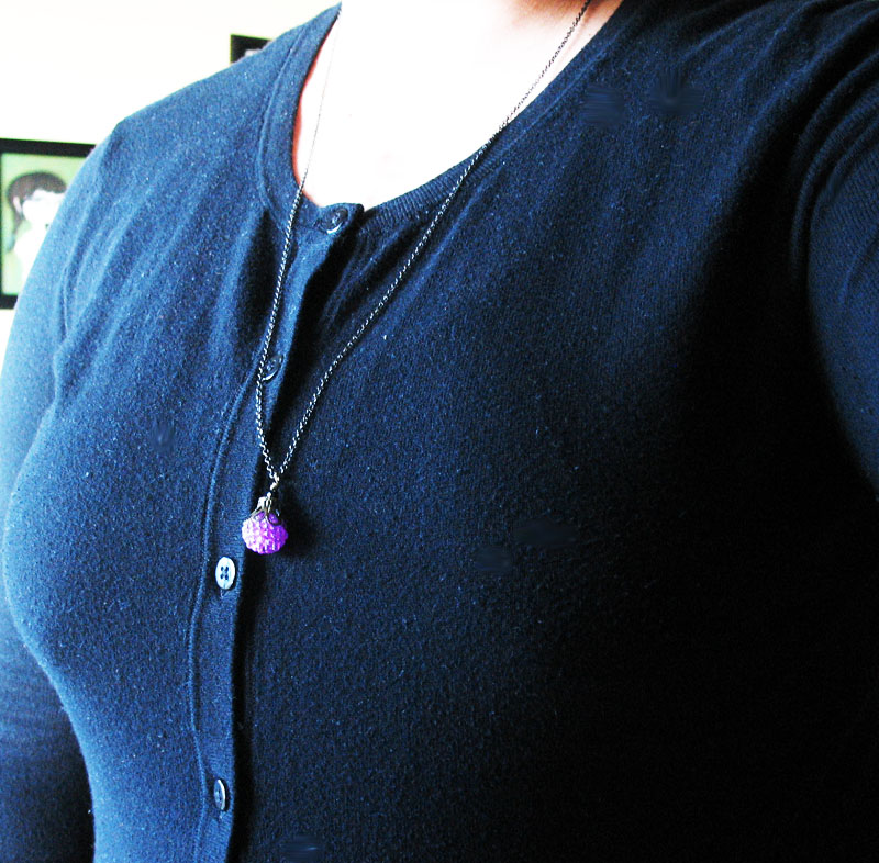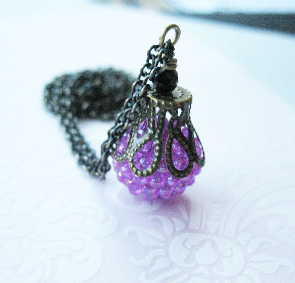 Eye-catching violet purple resin bead deserves all of the attention in this piece. Bead hangs from a long strand antiqued brass finish chain. Appropriate for formal or casual dressing.