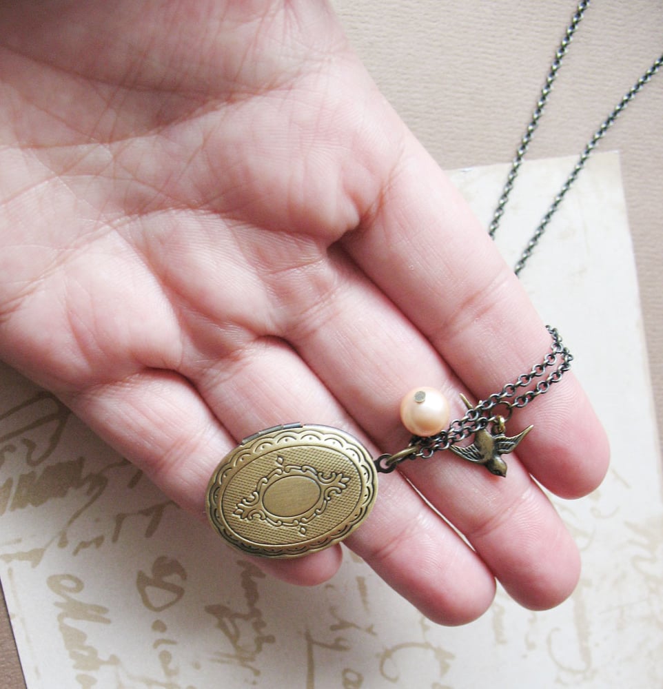 Beautiful antique bronze double sided oval locket hanging from a long strand antiqued brass finish chain. Also included is a single peach coat pearl bead and swallow bird charm. Appropriate for formal or casual dressing.