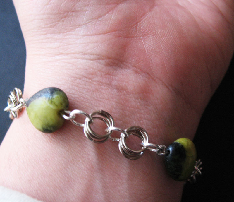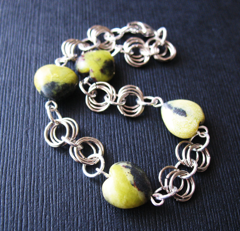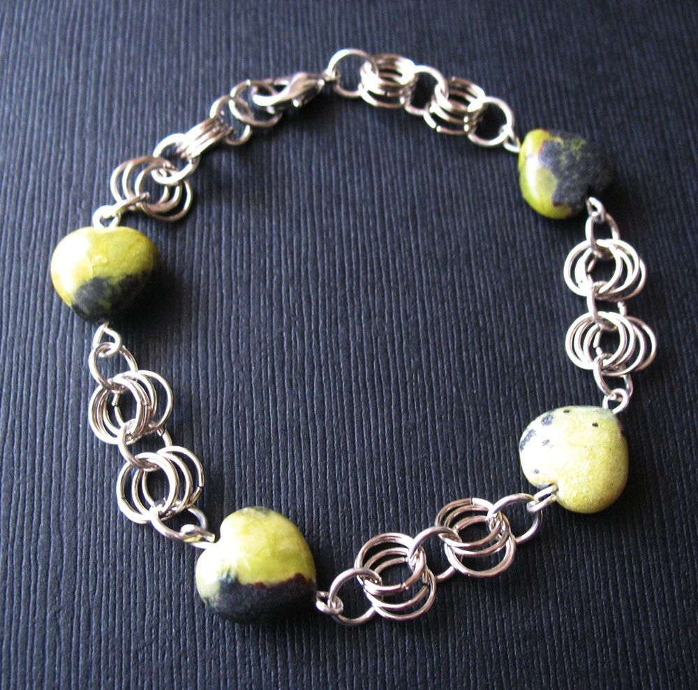 Handmade and inspired by the Japanese weave design - this chainmaille bracelet features stainless steel rings and beautiful heart shaped green fossil stone beads. I put this bracelet together by connecting and looping each ring. Comfortable and light weight.