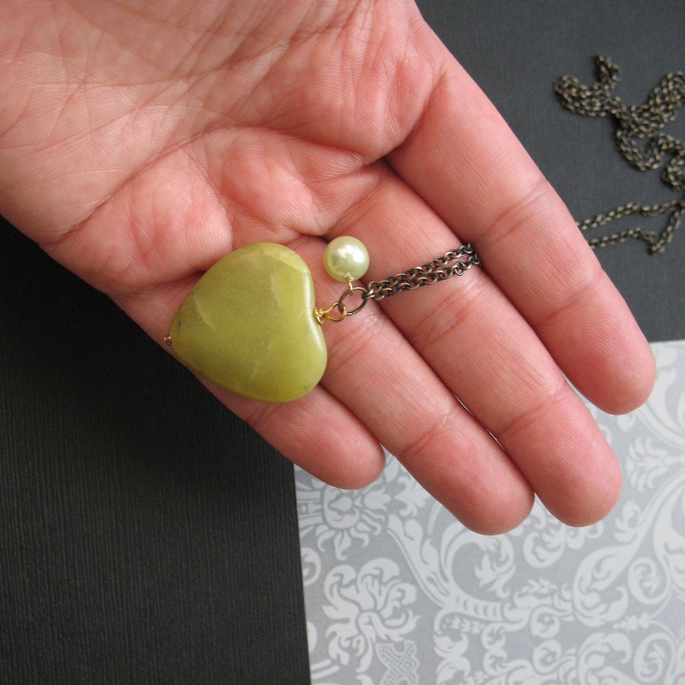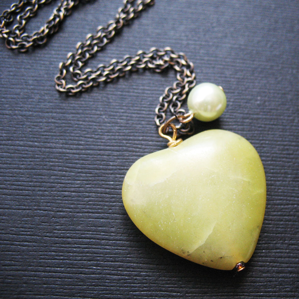 Large jade heart shaped bead hangs from a long strand antiqued brass finish chain. Also included is a single mint green pearl coat bead.