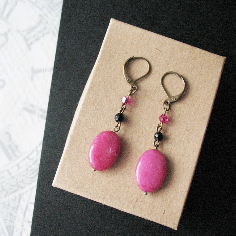 Handmade chandelier earrings featuring Magenta Pink Jade stones and highlighted by fuchsia pink Swarovski crystal beads and black czech glass beads. Gorgeous earrings for casual or evening wear.