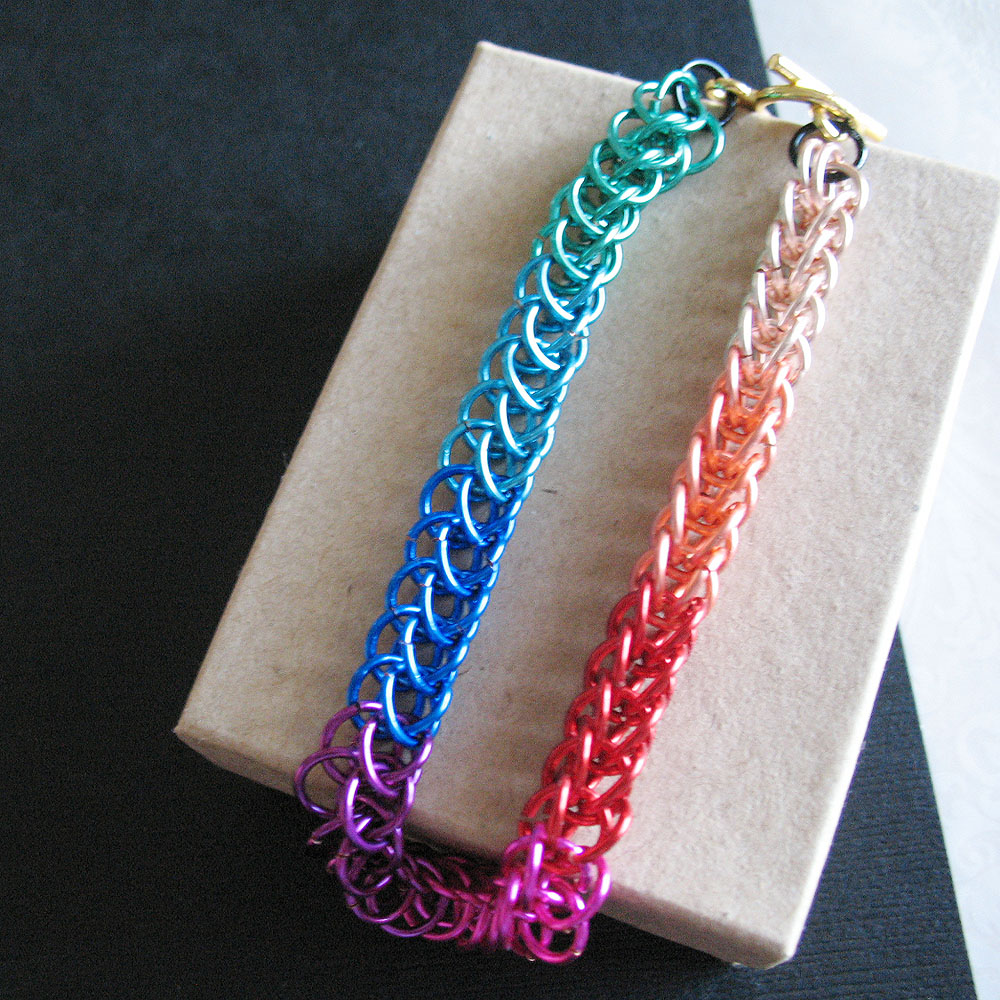Chainmaille bracelet is made with enameled copper jump rings measuring 7.6mm in RAINBOW: Turquoise, Pacific Blue, Flag Blue, Amethyst Purple, Fuchsia Pink, Red, Peach, and Rose Gold.