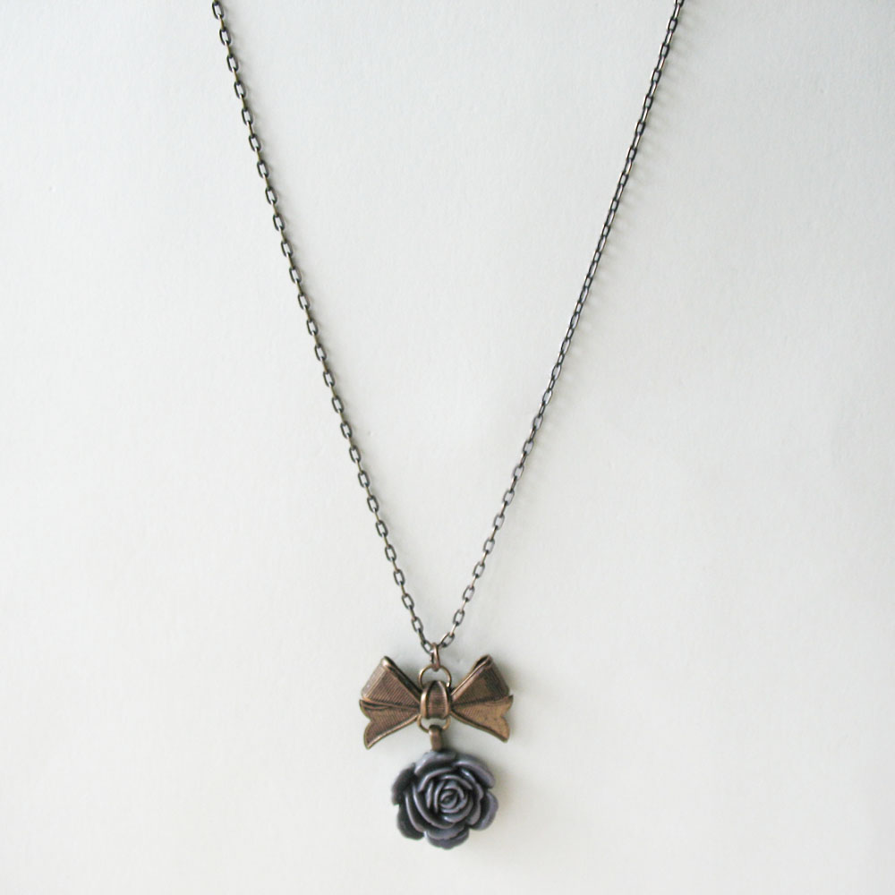 Long Strand Flower Necklace. Large Bow and Rose Charm Necklace. Gray Rose Necklace. Victorian Jewelry