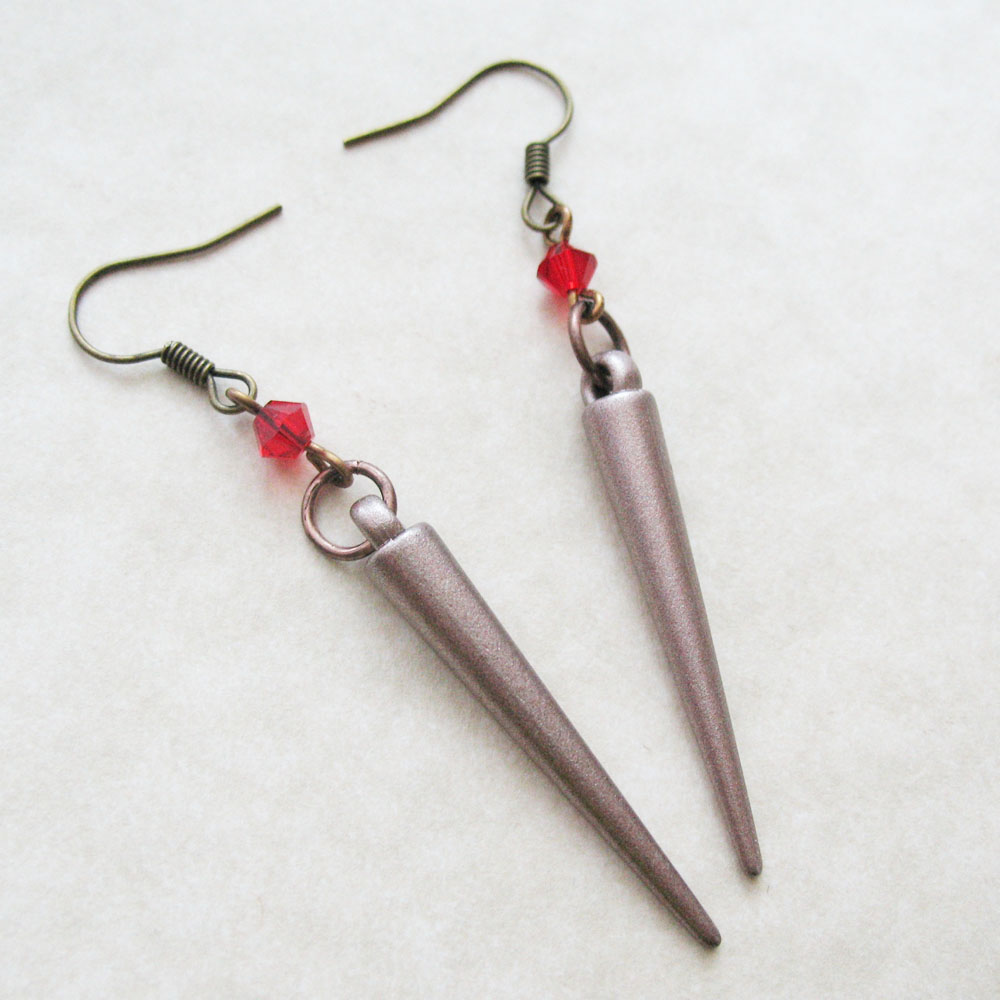 Lightweight spike earrings with a Ruby Red Swarovski Crystal for color. The spike are acrylic and ear hooks are antique brass finish (nickel free).
