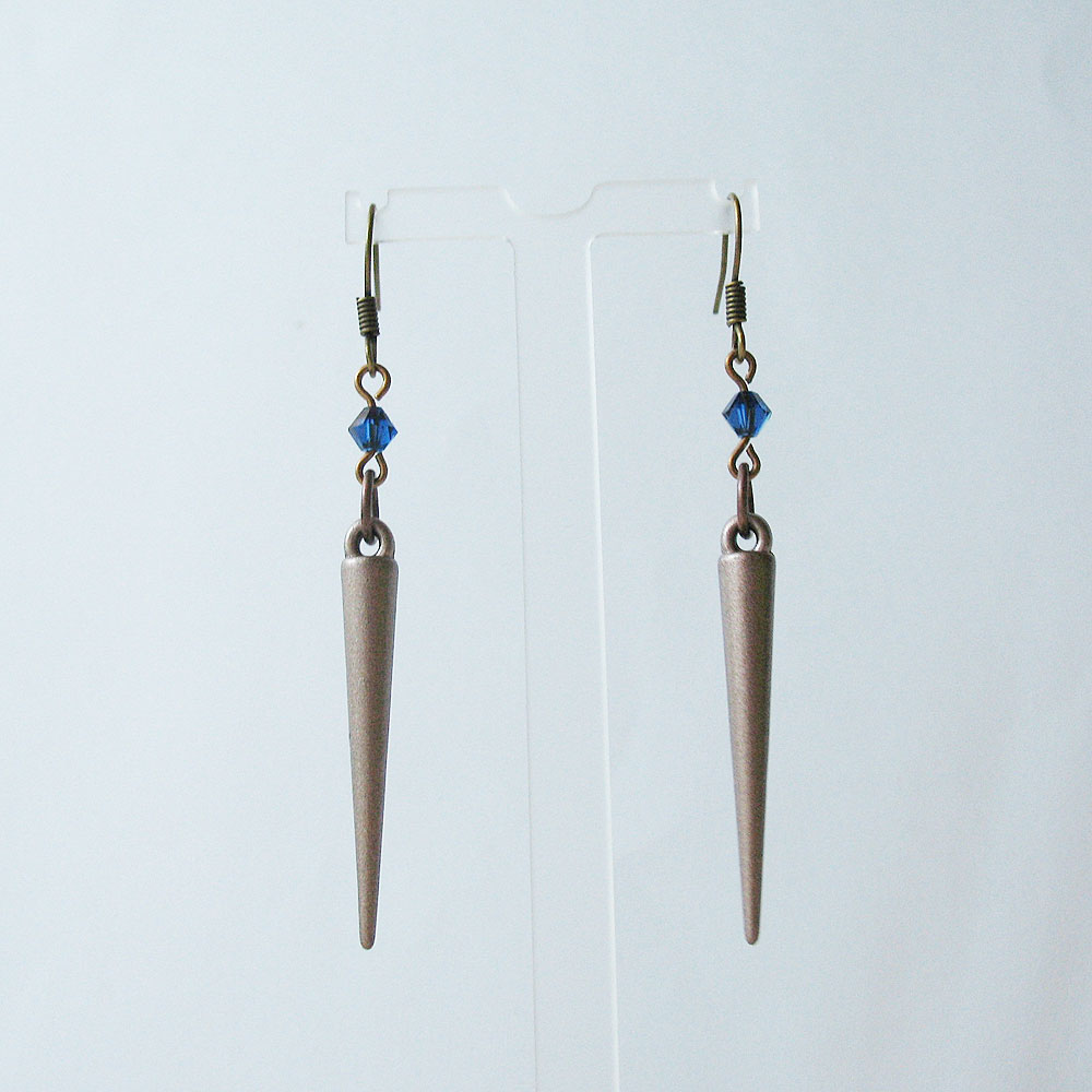 Lightweight spike earrings with a gorgeous Cobalt Blue Swarovski Crystal for color. The spike are acrylic and ear hooks are antique brass finish (nickel free).