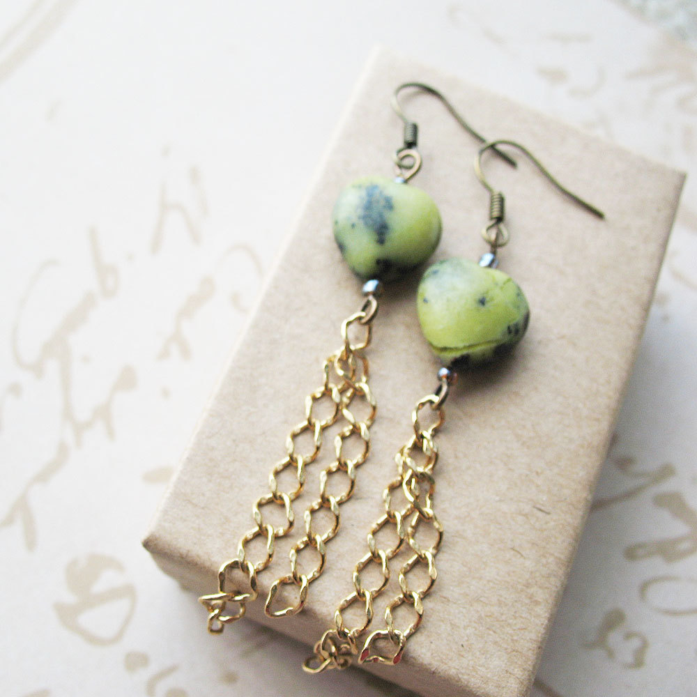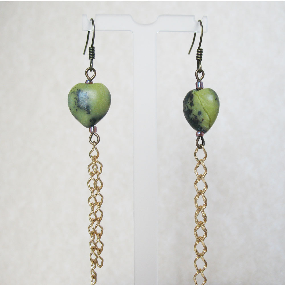 Boho Rocker inspired heart fossil stone earrings (Faustite) in a funky camouflage pattern with gold plated chain. Sweet with an edge!