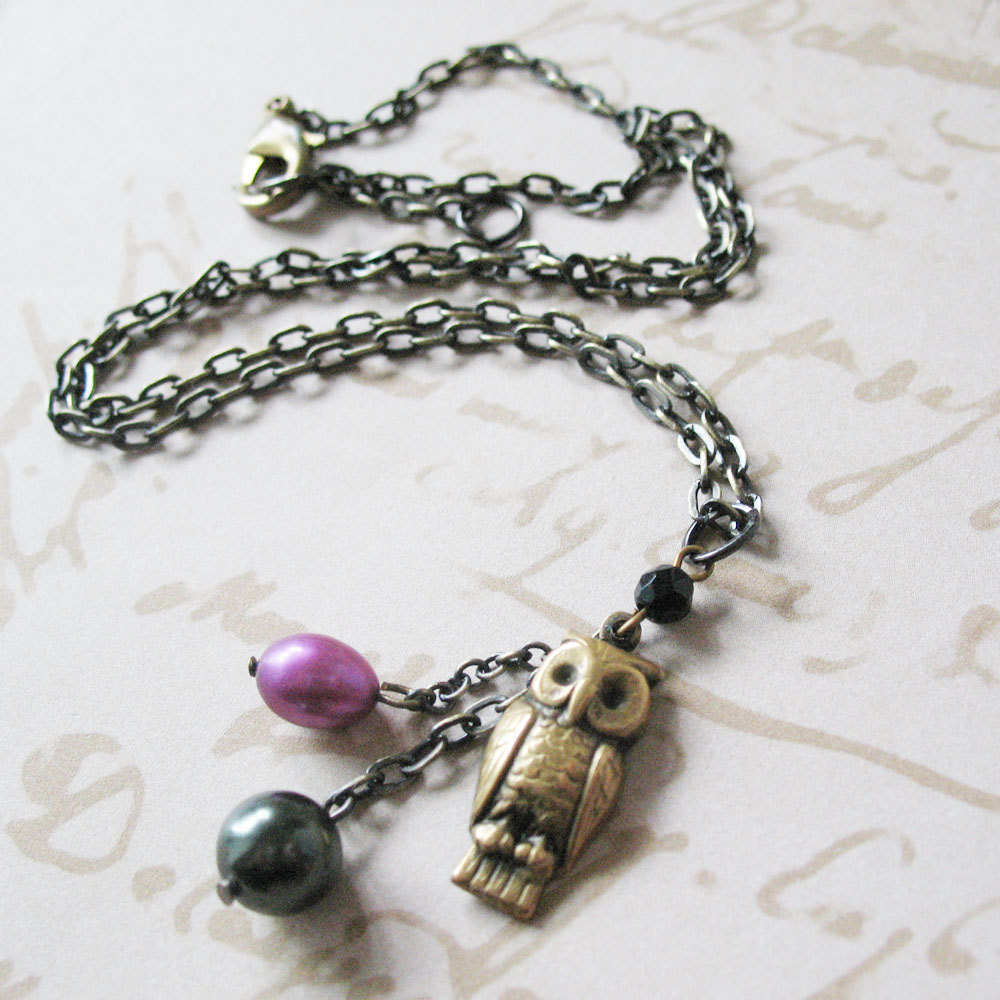 You love owls? Who doesn't love owls? :) Pretty brass owl charm (.75 inch) with fresh water and coated pearl beads.