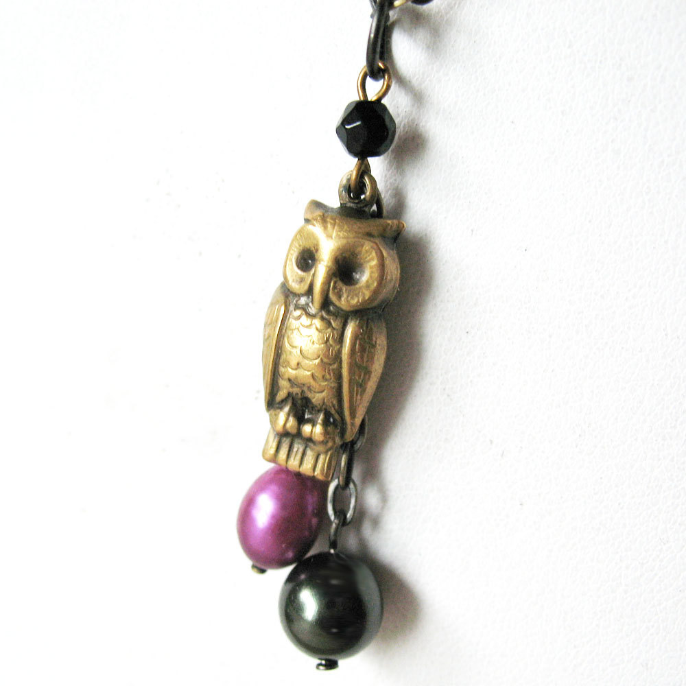 Owl Charm Necklace. Black and Purple Pearl Necklace. Cute Bird Necklace.