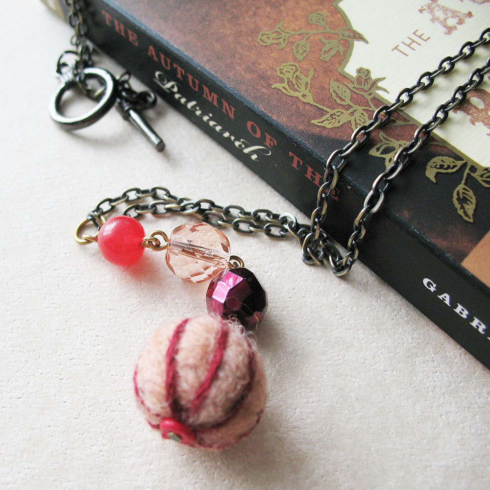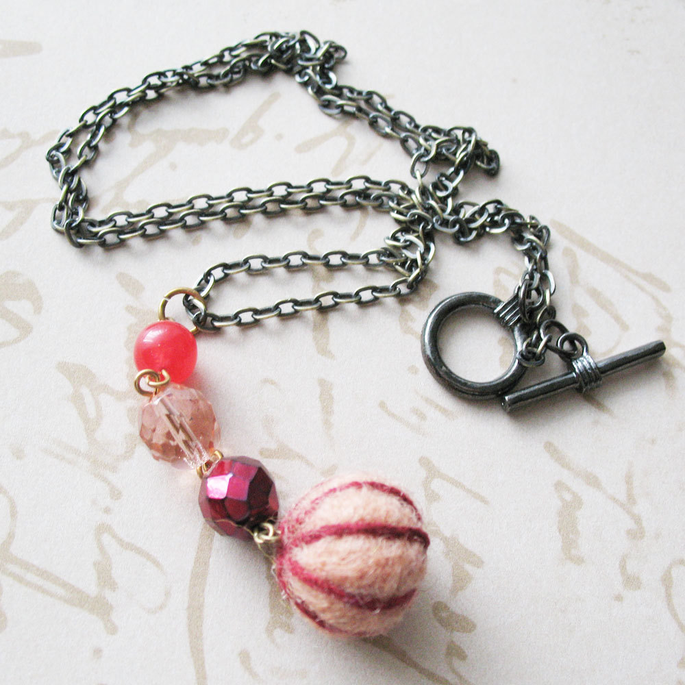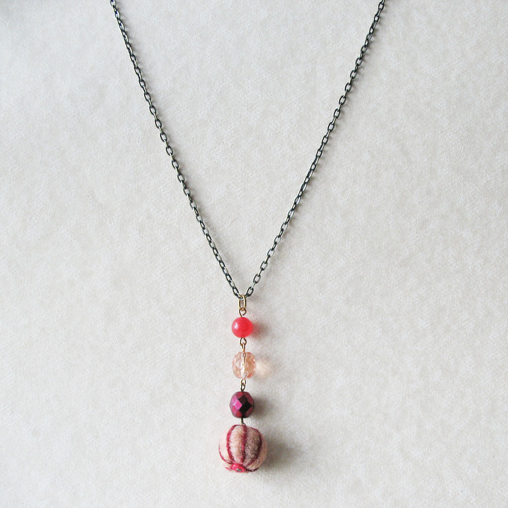 A mixture of my favorite shades of Autumn, this longer strand necklace features a orange & cranberry red stripe needle felt bead I made using all purpose Merino Wool, candy jade bead, and found czech glass beads. Great for a casual day out!