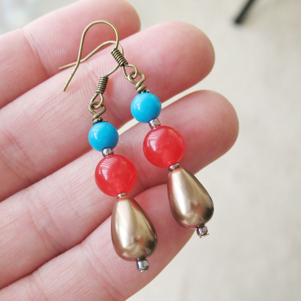 Beautiful light shade of latte brown pearl coated beads connected candy jade red and vintage blue beads. Earrings hang at 1.5 inches with smaller antique brass finish ear hooks at 19 mm- nickel free. Can be given as a gift, please specify during checkout.